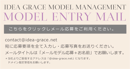 | COPYRIGHT(C) ALL RIGHT RESERVED IDEA GRACE 2013. 大阪・東京・上海の商業写真事務所型広告製作事務所・モデル事務所/モデルマネジメント・モデルキャスティングオフィス IDEA GRACE MODEL MANAGEMENT -イデアグラスモデルマネジメント- | (代表)06-6915-6910 |
